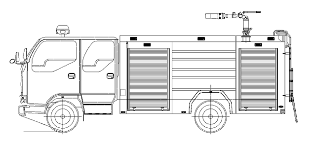 總體布置 | 整車由消防員乘員室和車身兩大部分組成,車身布置采用內藏罐式結構,左右兩側為器材箱,中部為水罐,器材箱后部為泵房。 |